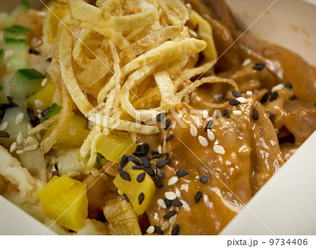 Wok with turkey meat, Soba noodles, paprika, mushrooms and carrot in take-out box