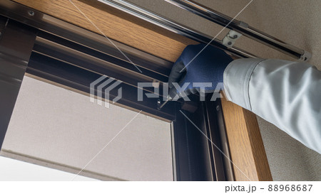 カッターで網戸を切る│網戸の張り替え・修理をする作業員イメージ