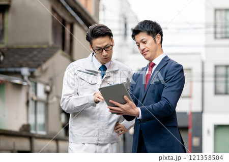 作業着姿の男性と打ち合わせるスーツ姿の女性