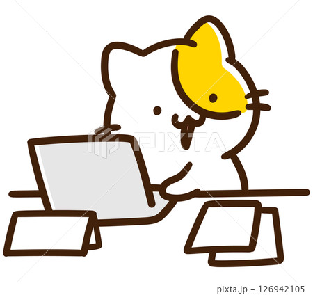 パソコン作業をしながら受け答えをするかわいいねこのキャラクターのデフォルメイラスト