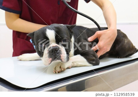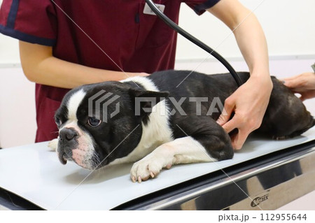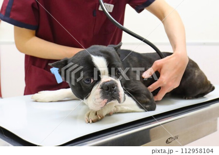 診察台の上に伏せて聴診器で検査するボストンテリアのマイティ君♡