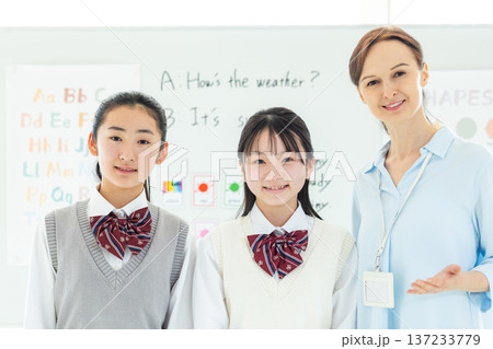 教育 英会話教室でレッスンを受ける中学生と外国人講師のポートレート