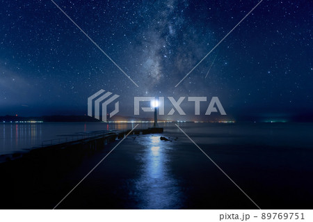 瀬詰崎灯台と天の川と流れ星 早崎海峡 長崎 口之津
