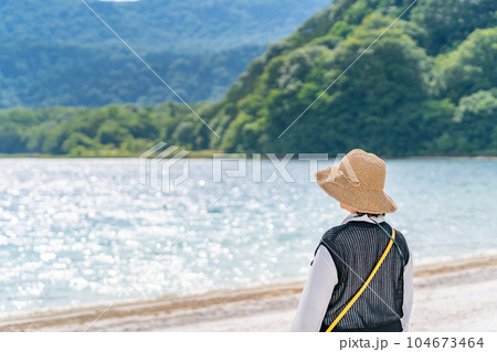 恐山 宇曽利山湖 極楽浜 佇む女性