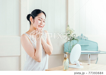 鏡を見ながら顎・頬を気にする若いアジア人男性(顎関節症・歯ぎしり・乾燥肌・スキンケア)