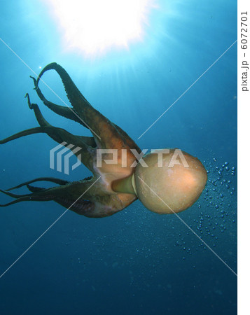 Octopus (Octopus Vulgaris) in open water and sun over sea surface