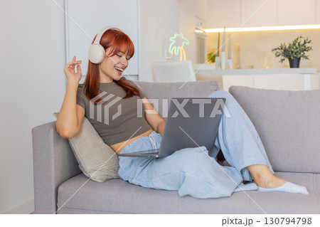 Young woman in headphones types email on laptop while music plays smiles and nods to rhythm focused