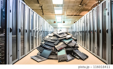 CG素材 サーバールームに積み上げられた不要となったパソコンのイメージ素材