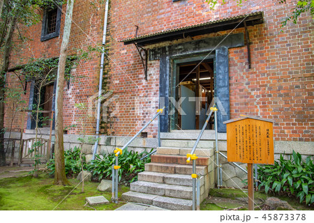 秋の諸戸氏庭園の入口 レンガ造りの蔵(三重県桑名市)