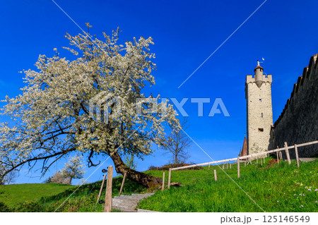 Tower in city wall of Lucerne (Musegg Wall) and white blossoming cherry tree at spring in Lucerne, Switzerland