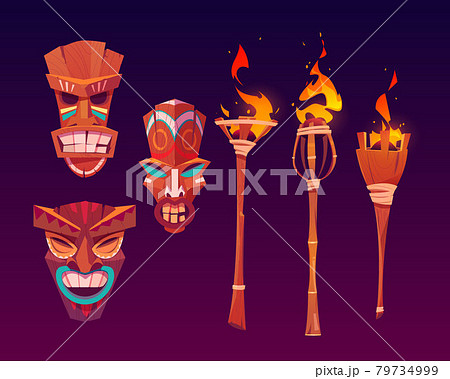 African tiki mask. Ethnic masks, totem hawaii or maya tribes. Wooden warrior gods faces, ornamental tribal aztec idols. Scary decorations decent vector set