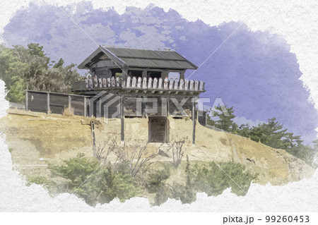 水彩画風 鬼ノ城 西門 岡山県総社市