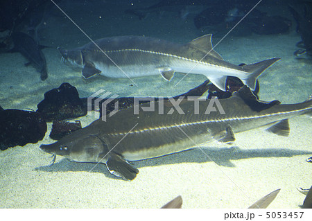 水族館で泳ぐチョウザメの群れ