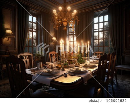A modern dining room for vintage dining rooms and dining sets, warm lighting from candlesticks and chandeliers. Generative AI