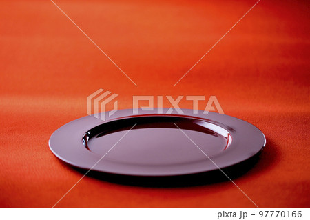 赤いちりめんの和布に黒い漆器の皿 日本のイメージ