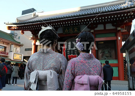 東京の下町浅草と浴衣を着た女性の後ろ姿