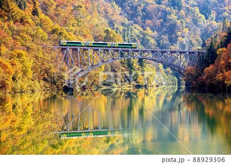 只見線 紅葉が美しい朝の第一只見川橋梁を渡る列車(福島県三島町、11月)