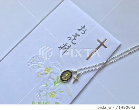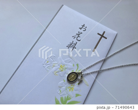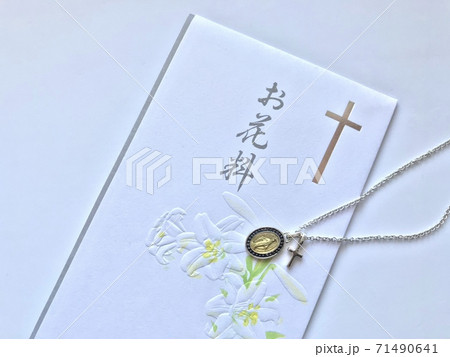キリスト教、クリスチャン向けの不祝儀袋、香典袋とメダイのネックレス(白バック)