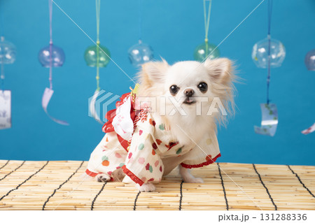 ブルーバックと風鈴と浴衣を着たチワワの夏那