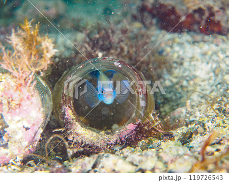 広口の漂流瓶に卵を産み付けた美しいソラスズメダイ(スズメダイ科)。 神奈川県三浦市荒井浜2024年