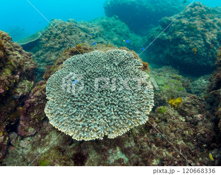 白化現象の美しいテーブルサンゴと可愛いヒメゴンベの幼魚他。静岡県伊豆半島賀茂郡南伊豆町中木ヒリゾ浜