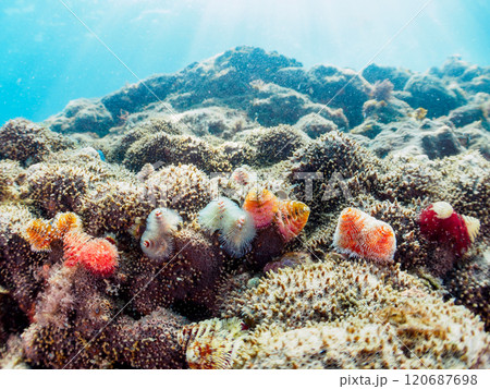 サンゴに寄生する、花のように美しいイバラカンザシ こう見えてゴカイの仲間の虫のエラである ヒリゾ浜