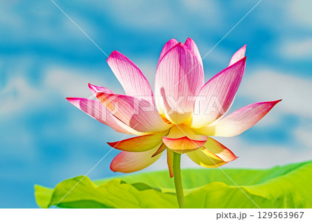 家の周りの草花 四季の色々 初夏の青空に向かって美しいピンクのハスの花が咲いています