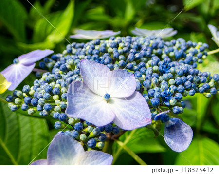 梅雨時期の美しい景色 咲き始めた清楚なヤマアジサイ