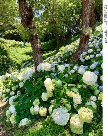 新緑の木陰で咲き競う白い紫陽花〈可睡ゆりの園/静岡県袋井市〉