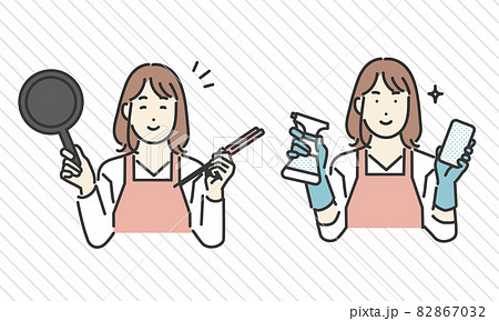フライパンを持って調理する女性と掃除用具を手に持って掃除をする女性のイメージイラスト素材