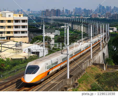 市街地を背景にカーブを曲がり走る台湾新幹線(台灣高鐵)