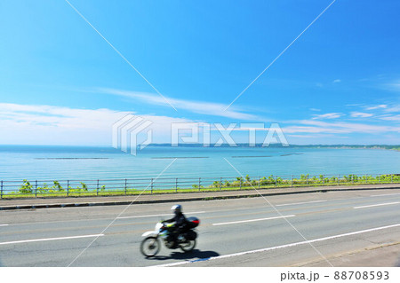オホーツク海と知床連山を背に走る3台のバイク 北海道