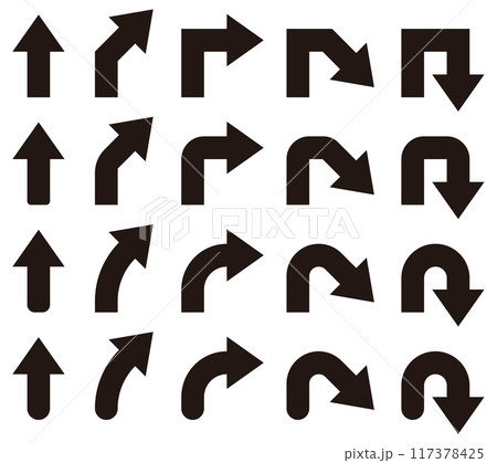 モノクロの曲がり矢印、カーブ矢印、Lターン矢印のベクターイラストセット