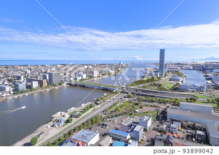 信濃川右岸(万代)から朱鷺メッセと万代島方向の街並み (俯瞰)