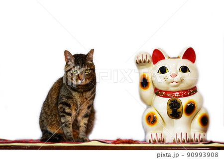 猫と招き猫。キジトラ。猫イメージ素材。白背景