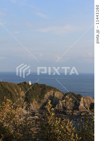 黒潮流れる碧い海原の水平線を背景に西日に輝く叶崎と灯台の風景 Ver1