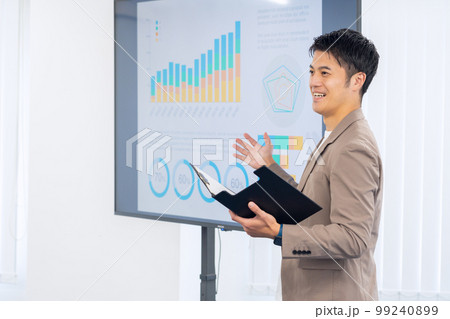 スクリーンを背景にしてスピーチをする若いビジネスパーソン