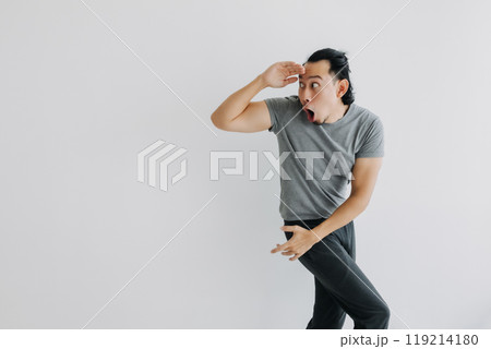 Unexpected surprise face man walking and turn on isolated background. Full body.