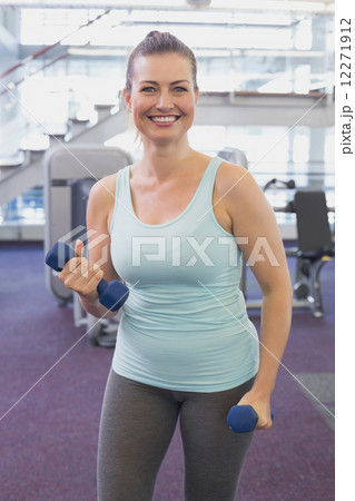 Pretty fit woman lifting blue dumbbell sitting on bench