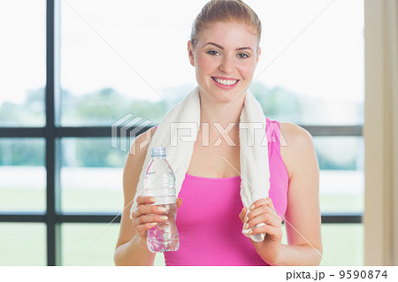 Young and fit pretty girl in exercise outfit holding red water bottle
