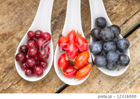 Fresh wild berries in ceramic spoons on wood background. Healthy food