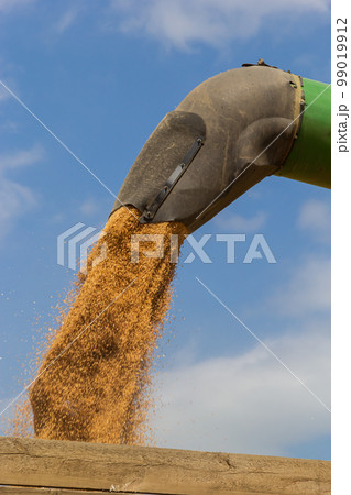 plant for processing and storing grain, loading grain into a truck body, close-up, crop