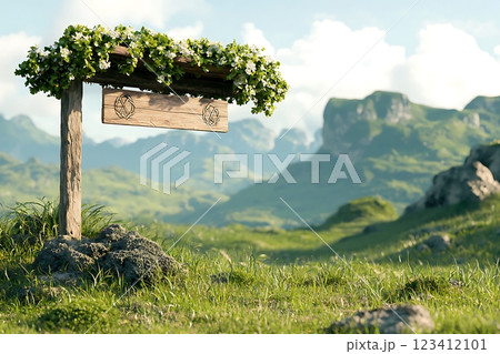 idyllic rustic wooden signpost with blooming flowers, set against a breathtaking mountain backdrop.