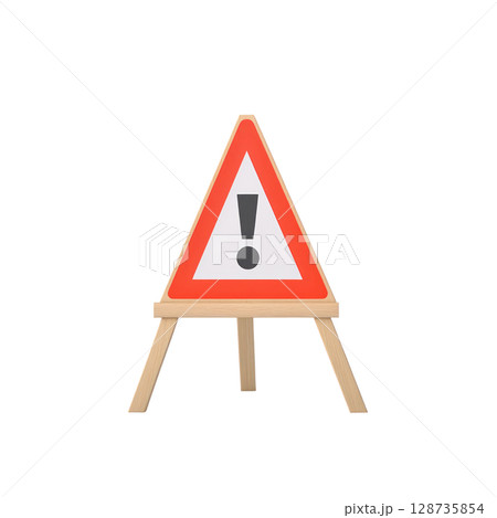Caution sign with exclamation mark on a wooden stand for alerting pedestrians in construction zones