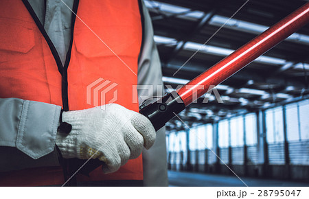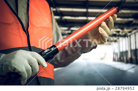 道路工事や建設現場で働く若い警備員 誘導棒で合図する男性のベクターイラスト素材