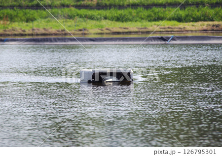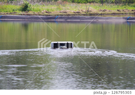 田植え前の水を張られた田んぼで水を掻き混ぜながら移動して雑草の成長を抑えるロボットが稼働している光景