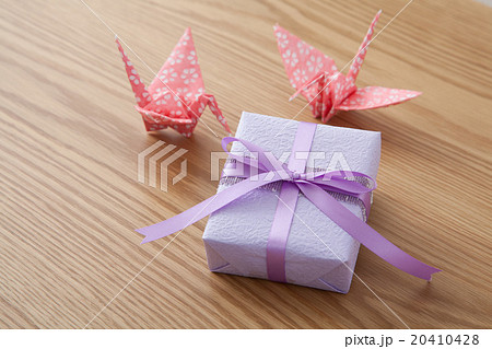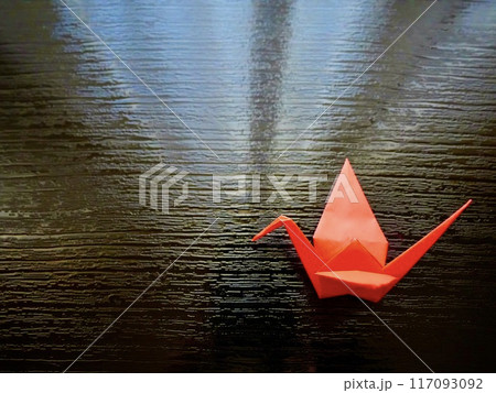 赤色の折り鶴 光注ぐ黒い木目調の背景