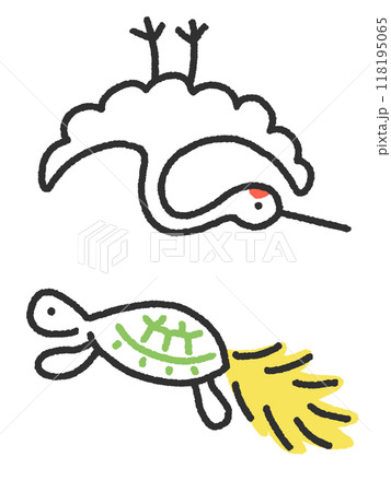 手描きのシンプルでかわいい鶴と亀のイラストセット 正月 長寿 祝い 蓑亀