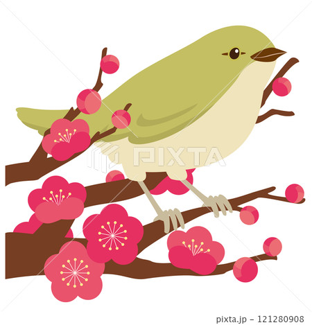 梅に鶯のベクターイラスト(紅梅・5弁花)