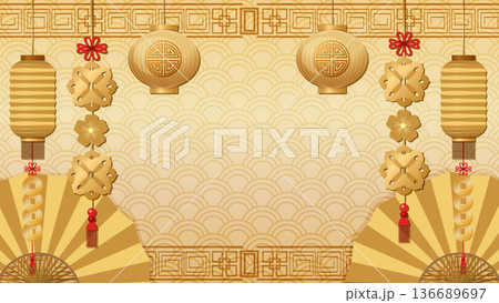Traditional Golden Chinese New Year Background with Lanterns and Fans